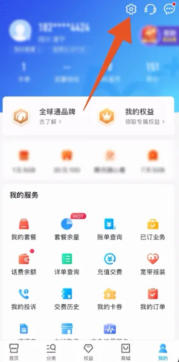 1、在中国移动我的页面中,找到页面右上角的设置图标,点击它。
