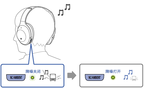 降噪功能:开(NC/AMBIENT按钮旁的指示灯(绿色)亮起)