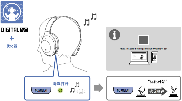 耳机打开时,戴上耳机,按住NC/AMBIENT按钮直至听到语音指导“优化开始”(约2秒钟)。