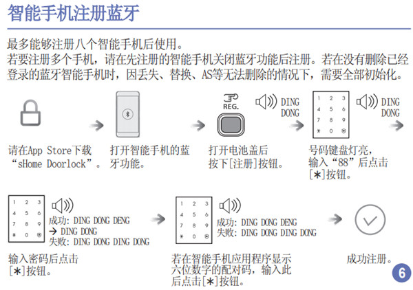 虽然这款三星DP728指纹锁连接手机蓝牙步骤颇多,但只要注意门锁步骤与手机APP步骤同步进行,按步骤一步一步来,其实也挺简单的。需要注意的是,如果您注册过蓝牙开锁的手机丢失了,请立马将指纹锁初始化,以免造成更大的损失。(“三星DP728指纹锁怎么初始化”)
