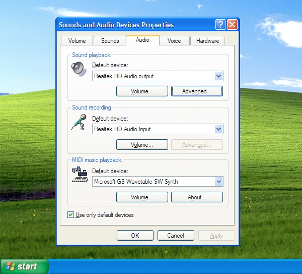 4、将会出现“Sounds and Audio Devices Properties”(声音和音频设备属性)窗口。从 "Sound Playback(声音播放)"选择区下面的 "Audio(音频)"选项卡上,从下拉菜单中选择蓝牙设备;
