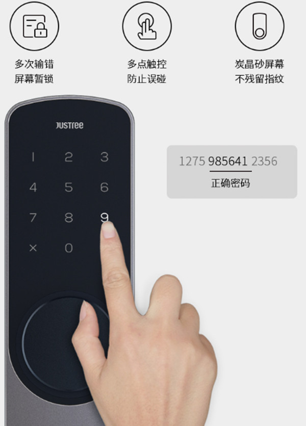 2.两款锁都有虚位密码功能,正确密码前后均可输入乱码,再加上特殊材质的触摸面板,指纹痕迹无残留,使得盗贼通过指纹屏幕猜出密码的概率为0。