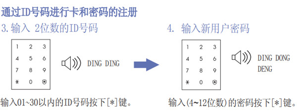 输入当前管理密码(初始管理密码“1234”),然后按 [*]键确认。然后输入两位数的ID号,按[*]键确认。(ID号范围01-30)