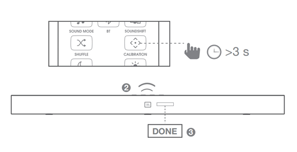 4、长按遥控器上的【CAUBRATION】键3秒以上即可成功完成设置环绕声音响的操作了。