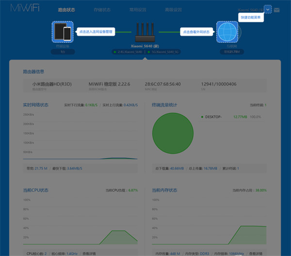 配置完成后,可以通过上网、WIFI、游戏加速、终端管理、更多功能等实现路由功能配置。WEB端管理界面主要有路由状态、存储状态、常用设置、高级设置四个选项。