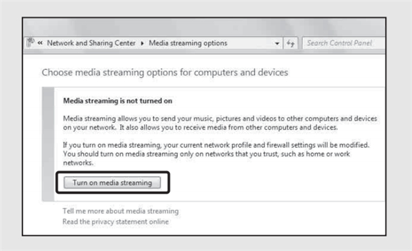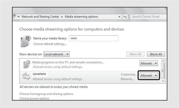 若要用本机播放电脑中存储的音乐文件,需要在本机和电脑之间进行媒体共享设置 (Windows Media Player 11 或更新版本)。这里,采用 Windows 7 中的 Windows Media Player 12 作为设置示例。