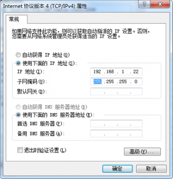 修改本地IP地址,鼠标右键单机右下角电脑图标选择【打开网络和共享中心】-【本地连接】-【属性】-【ipv4协议】,.IP地址修改为192.168.1.22,当然其他的ip也行,子网掩码设为255.255.255.0后保存。