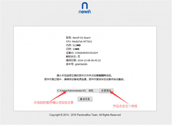 点击浏览,添加本地已经下载好的固件,确认固件添加进去之后,点击恢复固件。