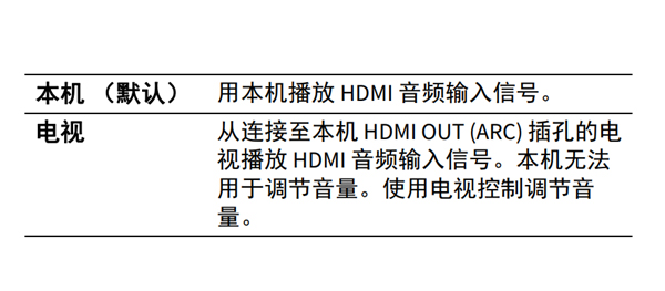 指定是否从本机或电视播放 HDMI 音频输入信号。