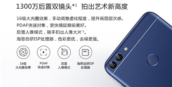 华为畅享7S拍照是这款产品的主打。该机前置800万像素美颜相机,后置主镜头上,华为畅享7S采用后置1300+200万像素双摄像,配置海思自研ISP处理器,最大光圈为F2.2。可以在拍照后重新调整光圈大小,自由选择背景虚化程度。