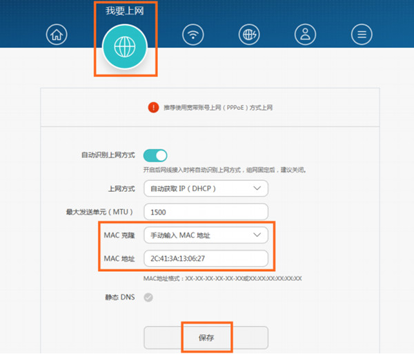 在“MAC 地址克隆”中选择“使用当前终端 MAC 地址”或“手动输入 MAC 地址”,让路由器克隆可以上网的那台计算机的 MAC 地址,最后单击“保存”。