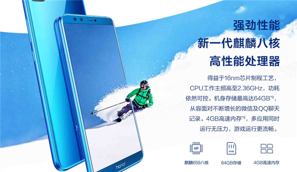 荣耀9青春版采用5.65英寸18:9屏幕,2160x1080分辨率,搭载最新一代麒麟659八核高速处理器,得益于16nm芯片制程工艺,工作主频高至2.36GHz,功耗依然可控。机身存储最高为64GB,满足一般用户的日常使用不成问题,4GB的运存应付多个应用同时运行无压力,游戏运行更流畅。