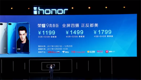 荣耀9青春版3GB+32GB标配版1199元;4GB+32GB高配版1499元;4GB+64GB 尊享版1799元。