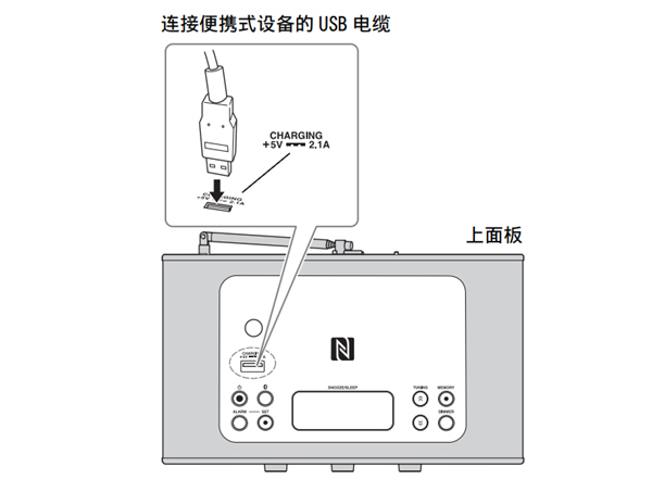 将智能手机或平板电脑等便携式设备连接到本机的 USB 端口即可对连接的设备充电 (支持最大 5V/2.1A 的电源)。