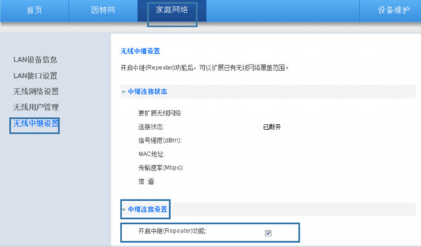 点击“家庭网络 > 无线中继设置 > 中继连接设置”。