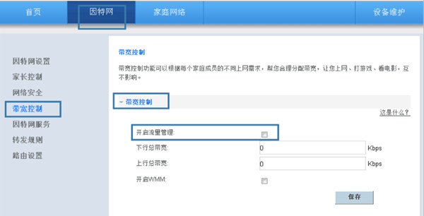 点击“因特网> 带宽控制”进入设置界面。