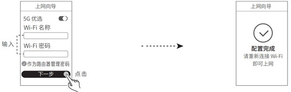 输入wifi的名称和密码,然后点击“下一步”,如果页面提示“设置成功”之后,重新连接该路由器wifi即可上网。(关闭“5G优选”功能可以分别设置2.4Gwifi和5Gwifi)