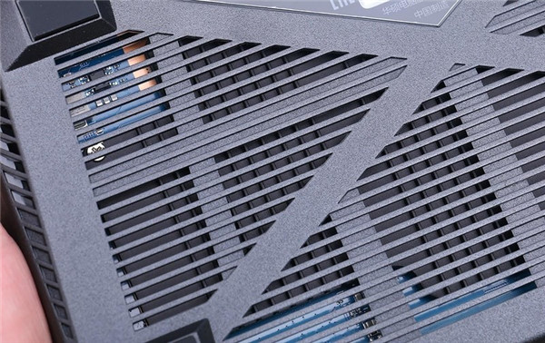 从散热孔的缝隙可以看到里面的铝制散热片,而且可以看到散热片表面使用了导风槽设计。