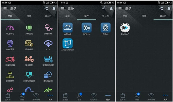 在功能页面可以找到大部分常用功能,另外插件部分还有几个华硕自家的应用,AiCloud是云存储应用,AiPlayer可以用手机播放连接到路由器的U盘中的媒体,至于AiCam则是华硕的云摄像机应用,毕竟是一家做软硬件多年的老牌厂家,配套软件做得比较到位,APP的功能在一定程度上提高了路由器的附加价值。