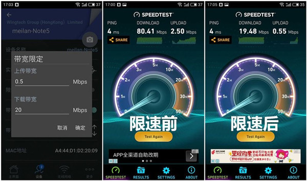 回头看看APP里面的限速功能,其实也算是简单的QoS,设置前后对比还是明显的。