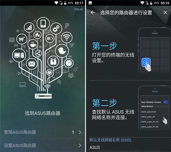 通过扫描包装盒上的二维码,可以方便的下载到华硕路由器的管理APP,黑色的界面主色调与PC浏览器端保持了高度一致,简单的设置向导,让第一次使用路由器的新手也能够轻松完成路由器的各项设置。