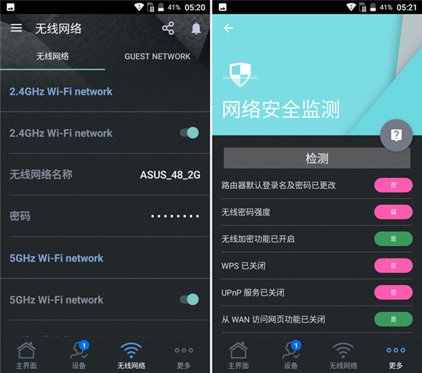 在移动端甚至可以完成复杂的无线网络设置,以及网络安全监测,并可以打开或关闭各项网络的功能设置。