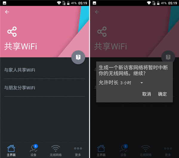 在移动端,很简单就能够完成wifi的共享,对于到访朋友的临时性访问,我们也可以生成一个新的访客网络用于临时连接,到期后就会自动关闭。