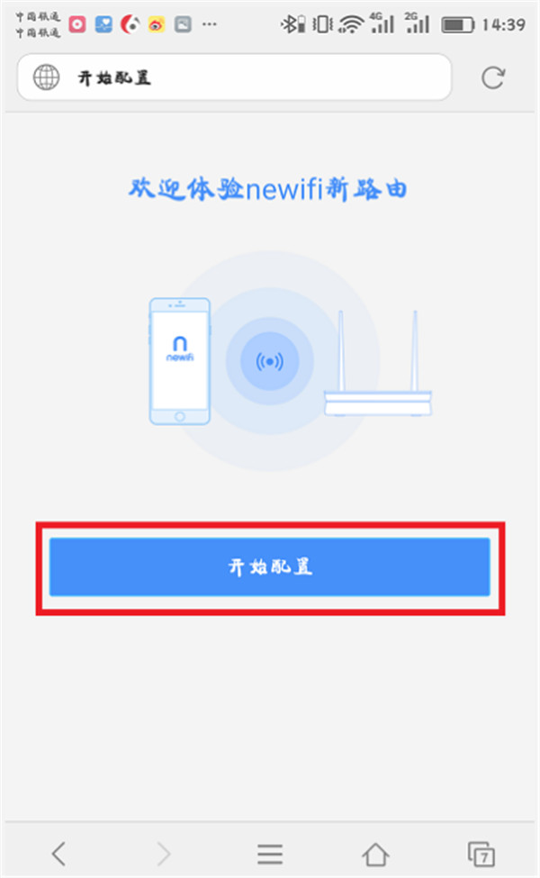 在手机浏览器地址栏中输入:192.168.99.1 打开设置页面——>点击“开始配置”。