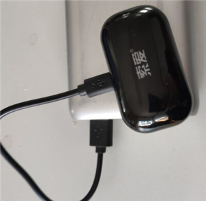 3.使用充电线比较小的一端插入充电盒的充电接口,将充电线比较大的一端连接到 USB 电源上或与 USB 充电接头连接并插入电源。