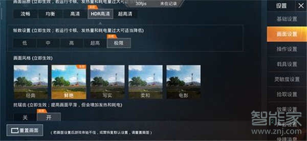 这里我们选用和平精英手游来测试红米k20pro电池续航能力,游戏环境设置如图:HDR高清+极限帧率(锁帧60fps)+鲜艳风格+抗锯齿开+阴影开+流畅自适应关闭。