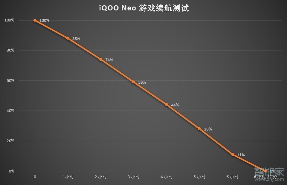 续航方面,iqooneo用于4500毫安大电池容量,我们以《王者荣耀》进行测试,在wifi环境下,关闭蓝牙、GPS,将手机屏幕亮度调到最高,静音,游戏画质、分辨率设置到最高,开启高帧率模式,《王者荣耀》训练模式单人对线,开局全部升满级,开启无敌模式,站在中路挂机,iqooneo从满电到电量耗尽关机共坚持了 6 小时 32 分钟。