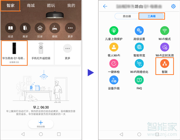 在首页智家点击需要访问的副路由对应的主路由,进入路由器管理页面,再点击工具箱 > 智联。
