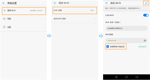 然后点击我的Wi-Fi > Wi-Fi 设置,勾选左下角的隐藏网络不被发现,点击右上角的“√”保存即可。