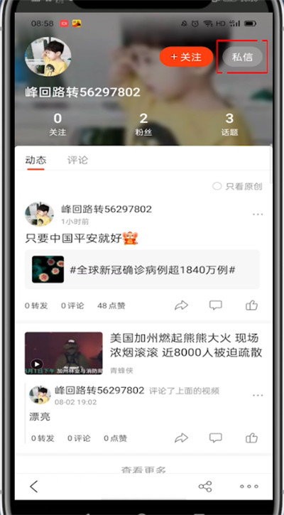 3、点击关注旁的私信