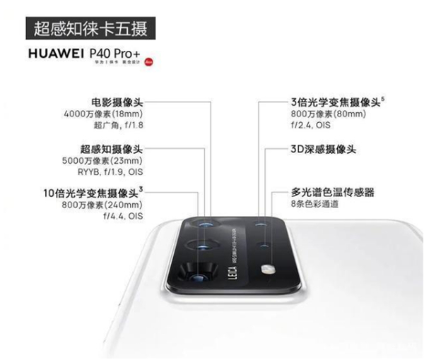 华为P40pro+前置双摄3200万像素+景深摄像头,后置摄像头搭载徕卡五摄:5000万像素主摄(广角, f/1.9光圈,OIS光学防抖)+4000万像素电影摄像头(超广角,f/1.8光圈)+800万像素超级变焦摄像头(f/4.4 光圈,OIS光学防抖)+800万像素长焦摄像头(f/2.4 光圈,OIS光学防抖)+3D深感镜头,支持10倍光学变焦, 20倍混合变焦,100倍数字变焦。