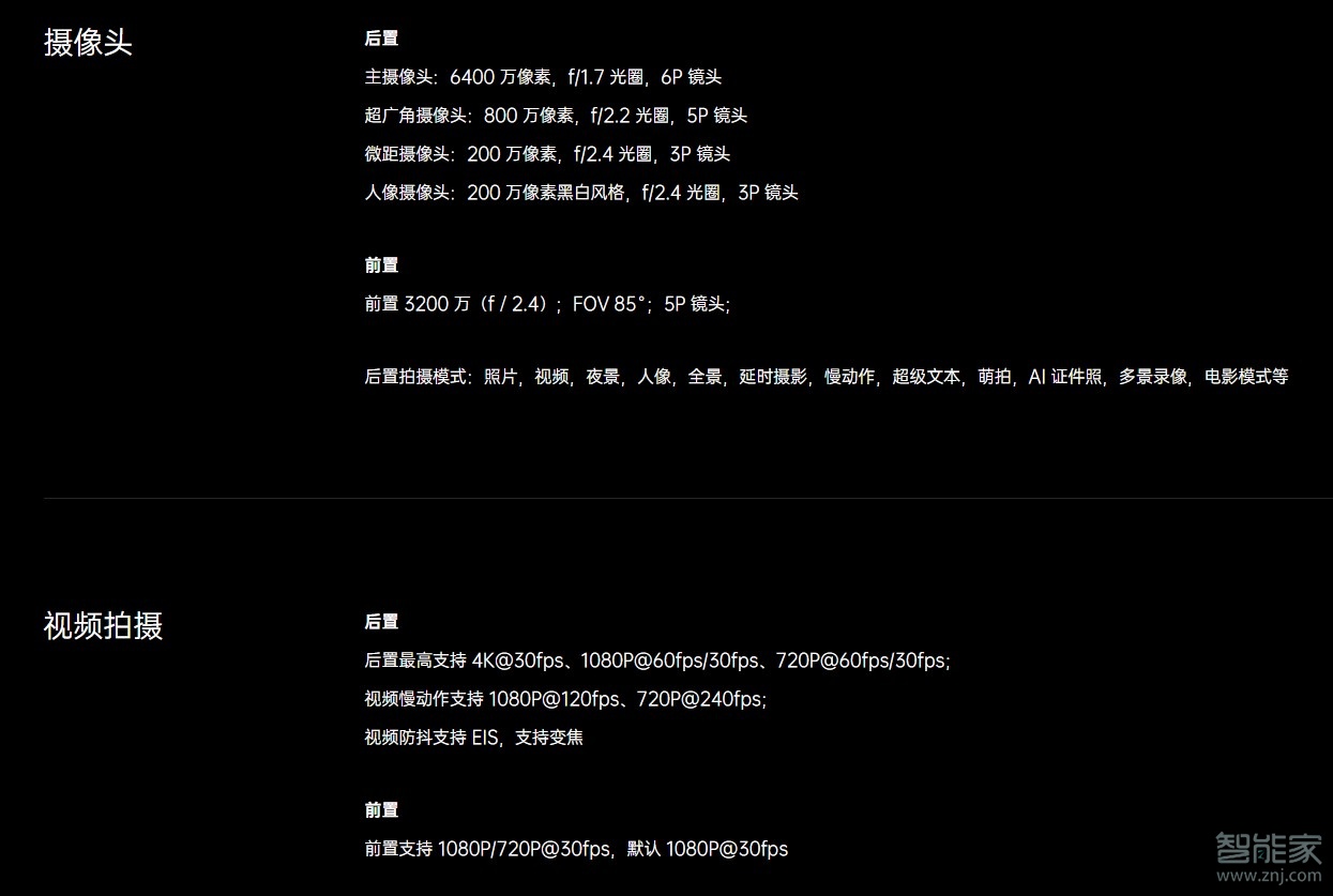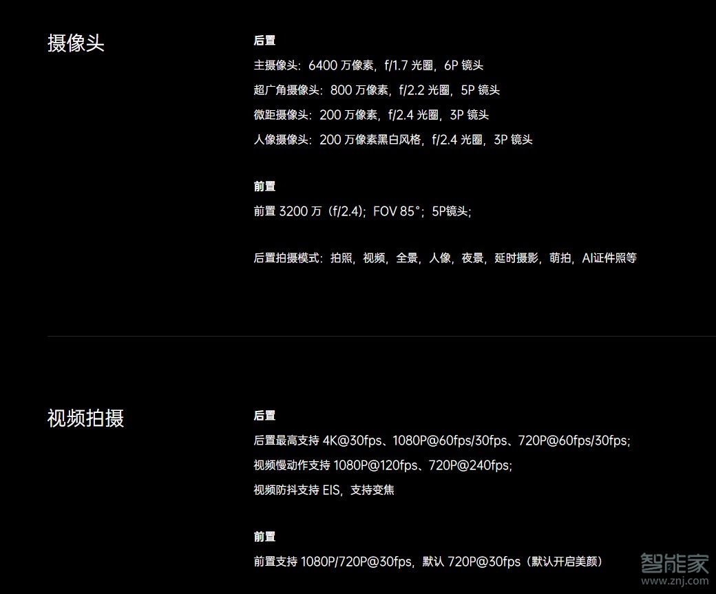 两款手机视频拍摄后置也一样,都是最高支持 4K@30fps、1080P@60fps/30fps、720P@60fps/30fps;视频慢动作支持 1080P@120fps、720P@240fps;视频防抖支持 EIS,支持变焦。 1080P/720P@30fps,默认 720P@30fps