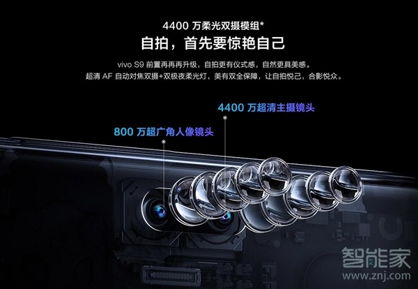 vivoS9搭载前置4400万+1600万双摄,后置四摄6400万+800万超广角+200万微距矩阵组合。