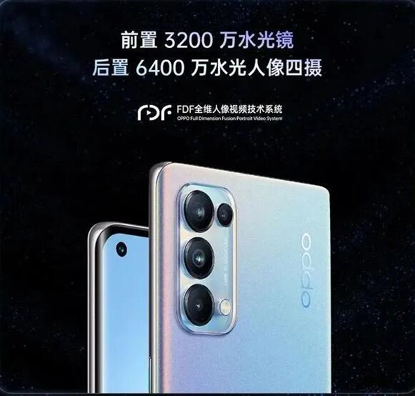OPPOReno5后置四摄像头,分别是6400万像素主摄+800万像素超广角+200万像微距+200万人像镜头,前置摄像头3200万像素;