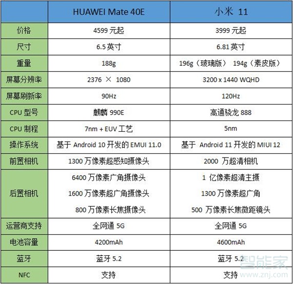 以上就是智能家小编给大家带来的关于“华为mate40e与小米11的区别”的全部内容了,了解更多智能资讯尽在智能家(m.znj.com)!