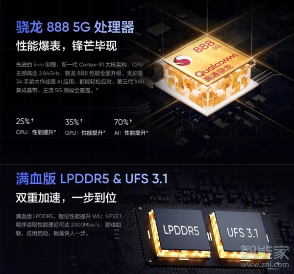 realme真我gt搭载高通骁龙888处理器,配置满血版 LPDDR5+UFS 3.1的内存和存储,骁龙888采用先进的5nm制程,新一代 Cortex-X1 大核架构,CPU 主频高达 2.84GHz,骁龙 888 性能全面升级,无论是 3A 手游大作或是 AI 应用,都能轻松应对,第三代 X60 集成基带,主流 5G 频段全覆盖。