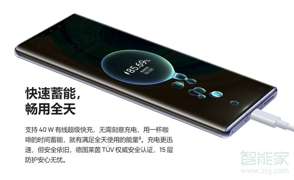华为Mate30EPro内置4500 mAh电池,最高支持40W快充,通过了德国莱茵 TUV安全认证,理论充电时间约为1.13小时,另外还有27 W华为无线超级快充,无线反向充电,手机理论待机时间为13.4天。