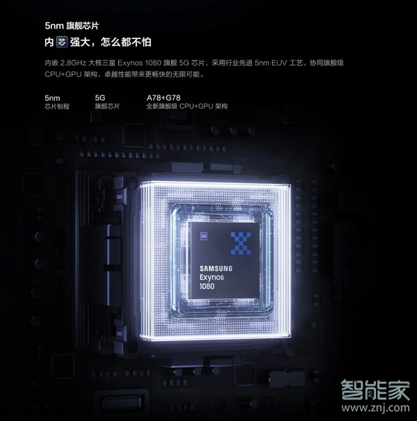 vivox60搭载Exynos 1080处理器,由一颗2.8GHz Cortex–A78+三颗2.6GHz Cortex-A78+四颗2.0GHz Cortex-A55组成。在8GB运存4的基础上、利用内存融合技术,可以调用3GB内存空间到运存进行使用,即刻享受8+3GB的运存快感,配置超快闪存UFS 3.1。