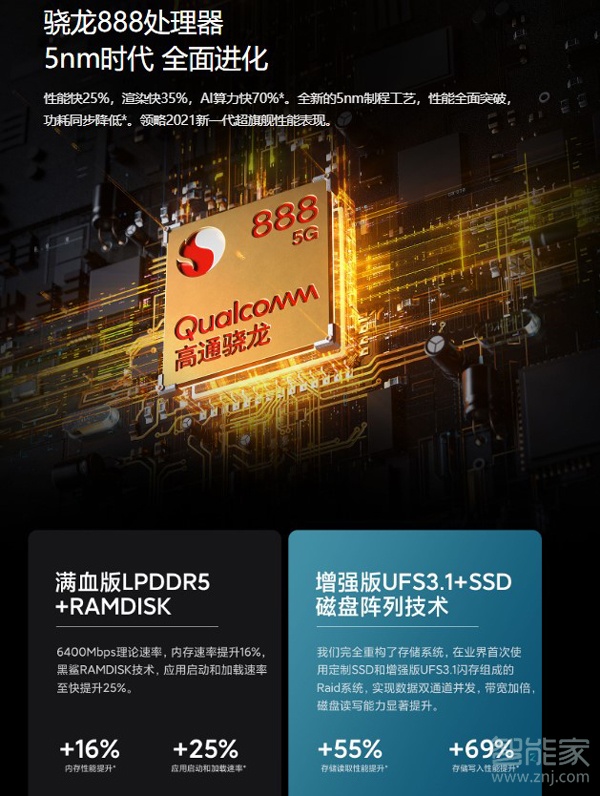 黑鲨4pro和一加9一样搭载高通骁龙888处理器,全新的5nm制程工艺,性能全面突破,功耗同步降低,性能快25%,渲染快35%,AI算力快70%。