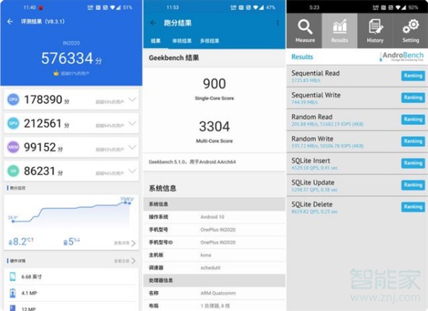 一加8pro搭载了骁龙865 处理器,GPU型号为高通 Adreno650,LPDDR5+UFS 3.0的存储组合。通过跑分软件测试,我们可以看到一加 8 Pro安兔兔成绩为576334分,Geekbench 5单核成绩为900分,多核成绩为3304分,从跑分成绩来看一加 8 Pro的性能表现符合高通骁龙865处理器性能。