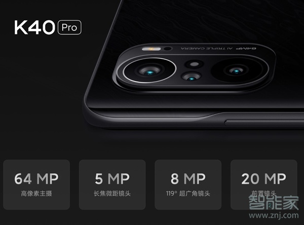 红米k40pro前置2000万像素单摄,后置6400万像素主摄+800万像素超广角镜头+500万像素长焦微距镜头的三摄组合,主摄采用的是采用的是索尼IMX686高清相机传感器,最高支持10倍数码变焦。