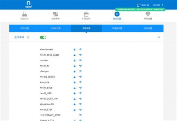 打开“无线中继开关”自动扫描周围的无线网络WiFi热点。根据信号强度不同依次列出可用的中继wifi热点,选择要中继的无线网络信号