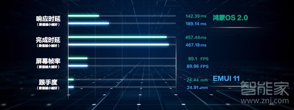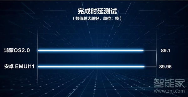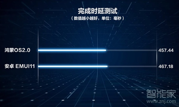 完成时延指的是用户对界面输入操作指令开始到系统完成指令并界面加载完成到可以正常阅读的稳定状态所用时间,时间越短越流畅。在完成时延方面搭载鸿蒙OS的华为p40pro时延为457.44毫秒,而搭载安卓系统的华为p40pro时延则为467.18毫秒,鸿蒙OS领先不到10毫秒,这个是肉眼完全无法感知到的。当完成时延太高,即便点击app图标后很快做出反应,但是你依然能够感受到手机很慢,就算拥有极其华丽的动效也无法瞒天过海。
