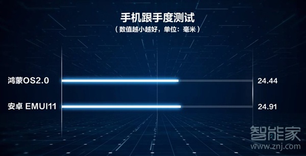跟手度指的是从用户在屏幕上发出指令,到手机系统报出触摸位置,并做出相应反馈的距离,使我们日常使用中感知最为明显的,数值也是越小越好。使用鸿蒙OS的华为p40pro跟手度数值与安卓并没有拉开太大的差距,不过还是要小一点,鸿蒙依旧是比安卓要快0.5毫米,肉眼根本感知不到。