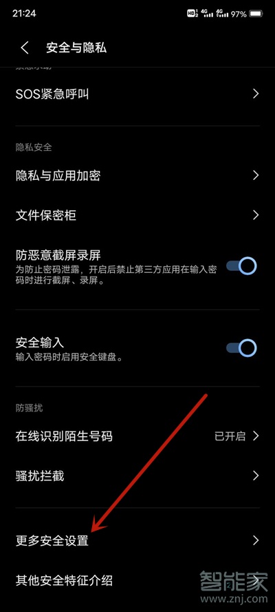 1、打开手机设置,找到安全与隐私选项里的更多安全设置。