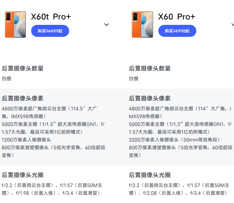 两款机型唯一的在于vivo X60 Pro+的人像镜头为3200W像素三星GD1传感器和f/2.08光圈的镜头;X60t Pro+的人像镜头为1200W像素索尼IMX663传感器和f/1.98光圈的镜头。